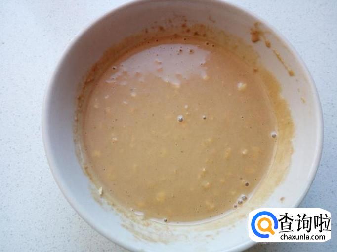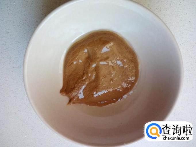 取一匙儿芝麻酱在碗中,放入水,拌和成浆糊状。