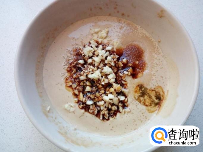 把蒜末放入拌和好的芝麻酱中,放入盐,味精,酱油,搅拌均匀,调拌成芝麻酱汁。