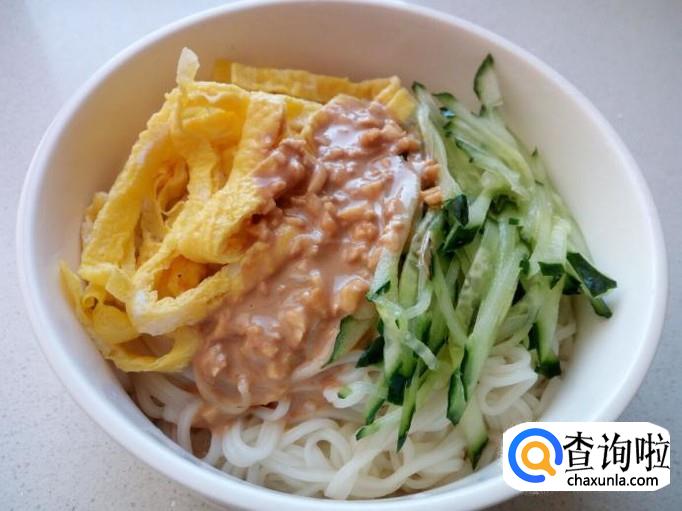 把面盛入碗中,放入黄瓜,鸡蛋丝,再放入调拌好的芝麻酱汁,即可食用。
