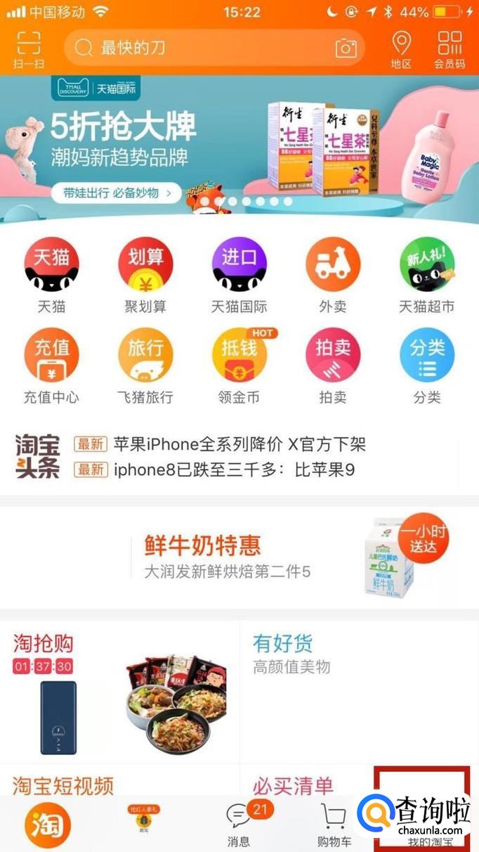 然后点击屏幕右下方的我的淘宝,如下图所示。