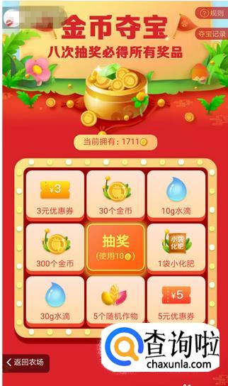 金币还可以参加活动,固定的活动是金币夺宝,入口在兑换左边。点开后可以使用10金币进行抽奖,100%中奖,不过一般中的都是优惠券。这个玩的时候要适当哦。 建议最多抽7次,需要金币1440,如果不到7次就抽到了特殊作物的果实,就可以停止了。