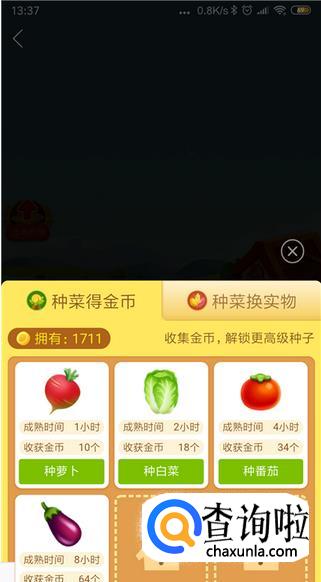 首先需要大家明白的是这个游戏的所有任务都是和金币有关的。种植蔬菜可以获得金币。种植蔬菜的成熟时间越短,获得的金币数量就越多。所以需要大家频繁的登陆这些游戏,经常种植蔬菜收获蔬菜,对农场进行操作,这样金币就会越来越多。