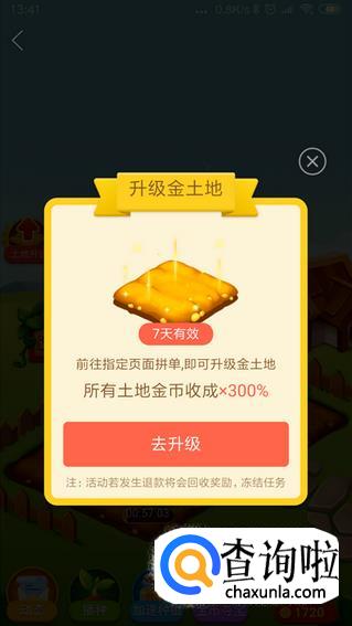 之前版本的多多农场是可以升级农场的,最新版本的农场已经改变成了升级土地。升级的土地越高,就可以收获更多金币,并且解锁更高级的种子。农场最初只有两块土地,目前 最多土地是六块,需要一点点开启。这个开启需要拥有一定数额的金币。金币 数量够了就可以开启土地,开启土地不会减少金币。为了能更快的获取金币,小编建议最好先将所有土地都开启,再动用金币做其他的。