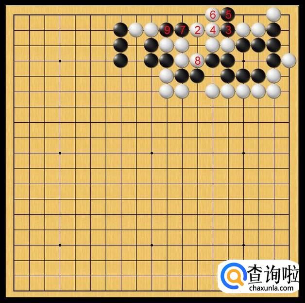 这个时候,黑棋也在黑9处就此一长。现在,黑棋叫吃黑白边界处的白四子。白棋如果粘上白四子,那黑棋继续打吃白棋,白棋就此灭亡。白棋如果不粘上白四子,而先提掉白棋内部底线的黑二子,那黑棋将会提掉黑白边界处的白四子。由于白棋被分断开来,所以白棋无法做起两个眼,白棋就被黑棋消灭。如图所示。