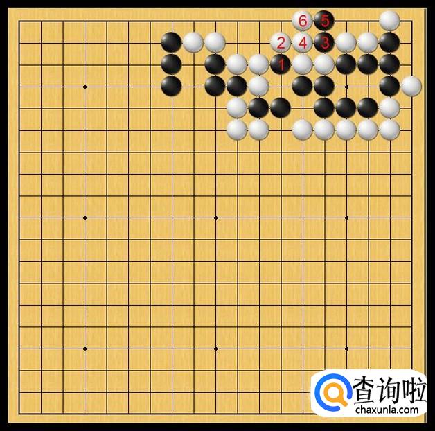 这个时候,白棋发现,不能在白棋右上角底线白二子处落子打吃黑二子,一旦白棋落子,将会被黑棋提掉。于是,白棋也在紧贴黑二子的白6处立,白棋也通过白6的立对白棋内部的黑二子形成了打吃。如图所示。