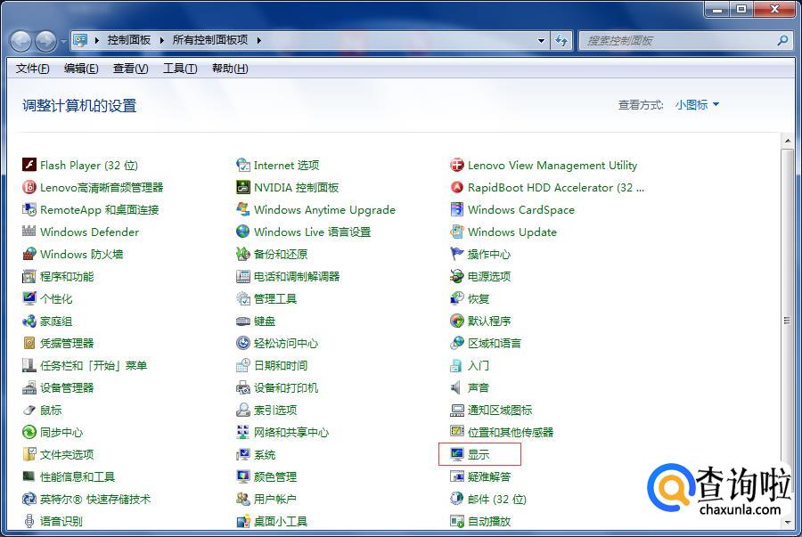 在开始里打开“控制面板”,找到“显示”,点击进入显示选项。