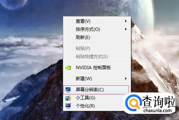 在桌面点击右键,在弹出的菜单中选择“屏幕分辨率”,或者进入个性化设置也可以。