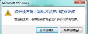 选择好之后点击 应用,会有个提示,需要重新启动电脑即可生效。可以选择立即注销还是稍后注销。