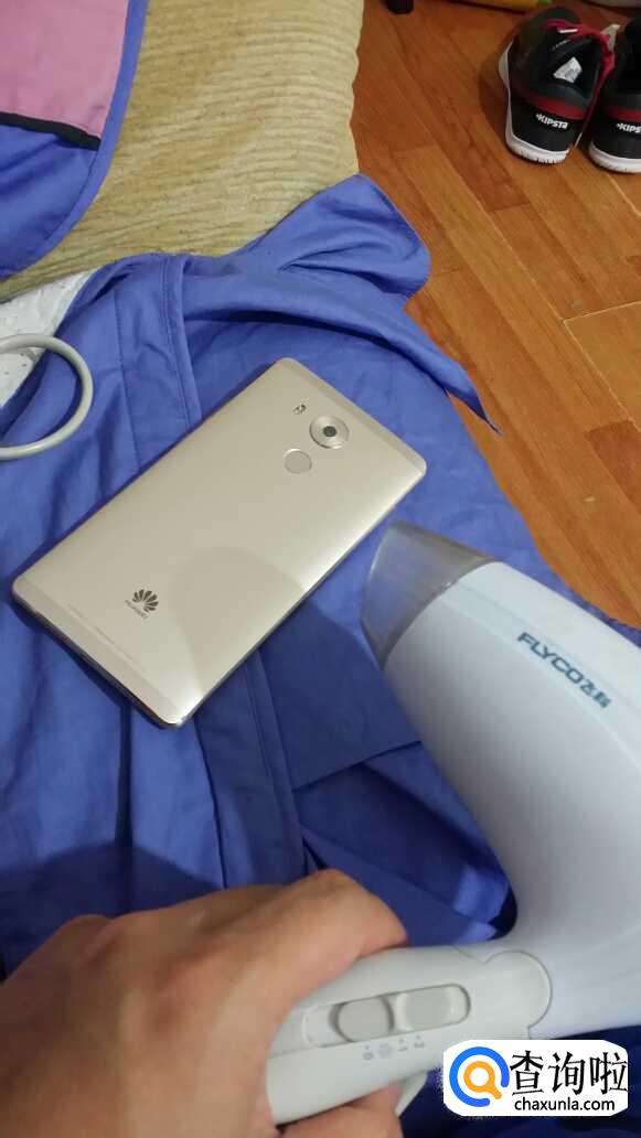 然后,我们拿出吹风机,用吹风机对手机屏幕有水印的地方吹吹风。吹完以后把手机单独放在一个干燥的地方。