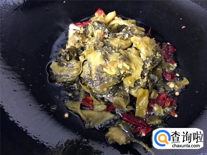 烧热锅放油,先放入红辣椒放进去几秒钟后,再把酸菜放入锅里炒干水分。