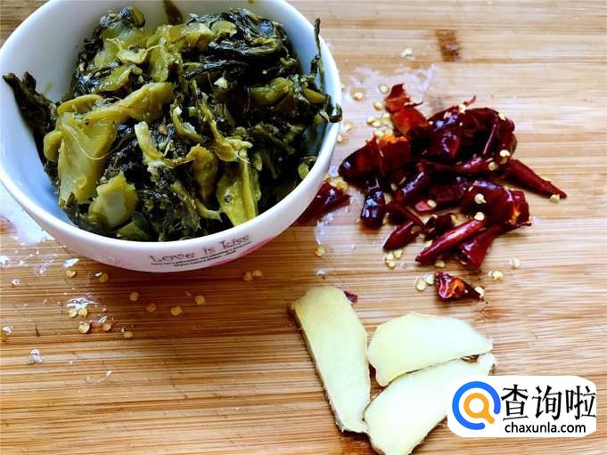 准备辅料,酸菜,红辣椒,姜片,如下图。