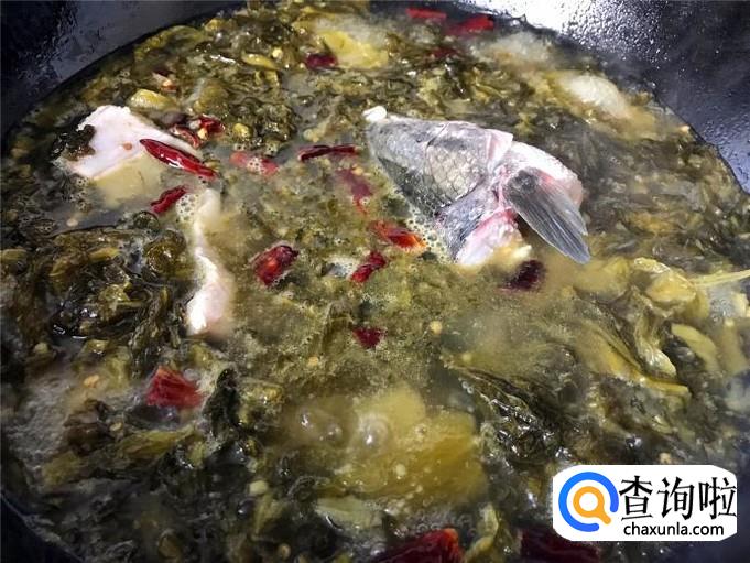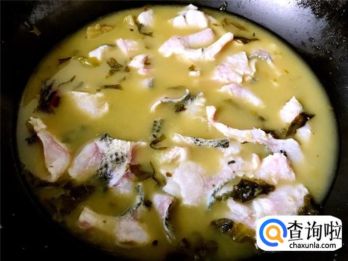 把鱼头和酸菜先捞出来放到大汤碗里,锅里留下酸菜汤,把鱼下入锅中,加入少许鸡精,待鱼片煮熟后关火。