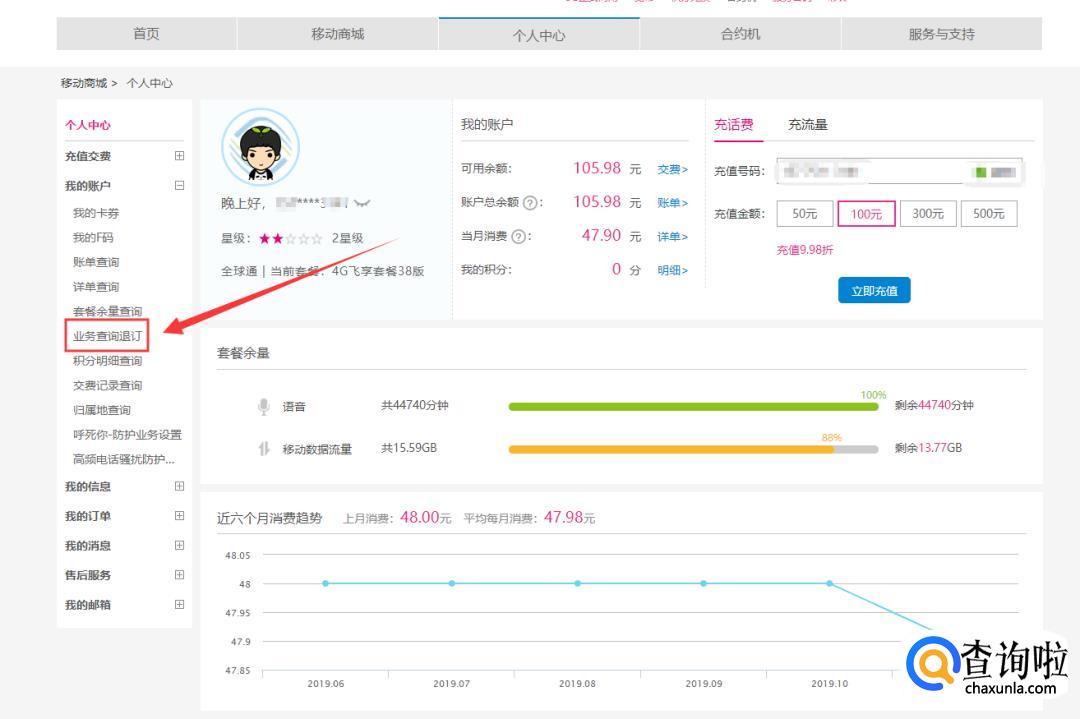 然后个人中心页面的左边方框找到我的账户下的【业务查询退订】并点击它。