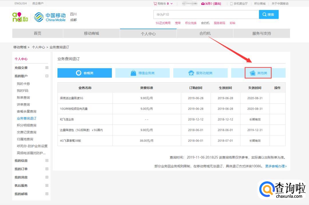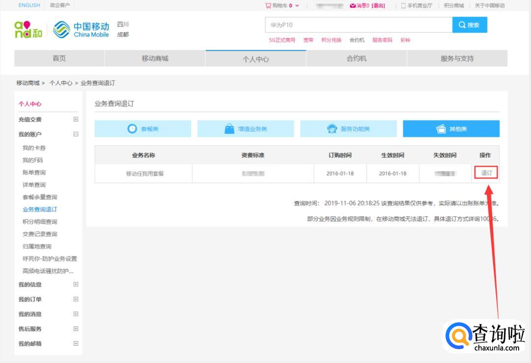 在【其他类】的页面上可以看到任我用套餐的退订页面。我们只需要点击该业务后的【退订】即可完成退订。