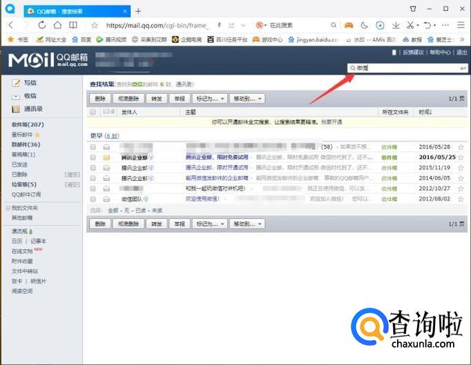 首先打开并且登录当初注册微信的邮箱,在右上角搜索框中输入微信,并且点击搜索