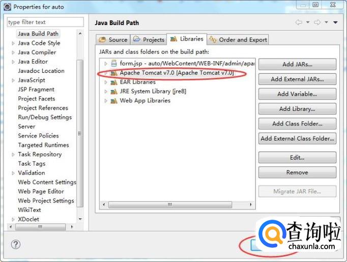 在libraries中选中【Apache Tomcat v7.0】即可,点击【OK】,如下图所示: