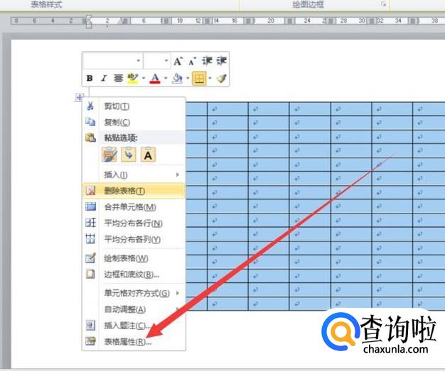 选中整个表格,右击一下,选择“表格属性”,点击并进入,如图所示。