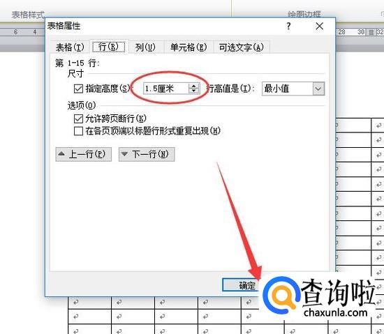 进入之后,将行高和列宽均设置为1.5厘米,点击“确定”,如图所示。