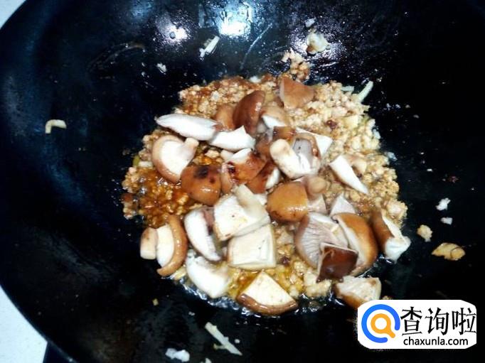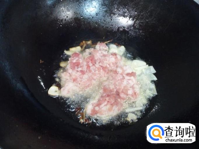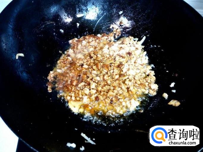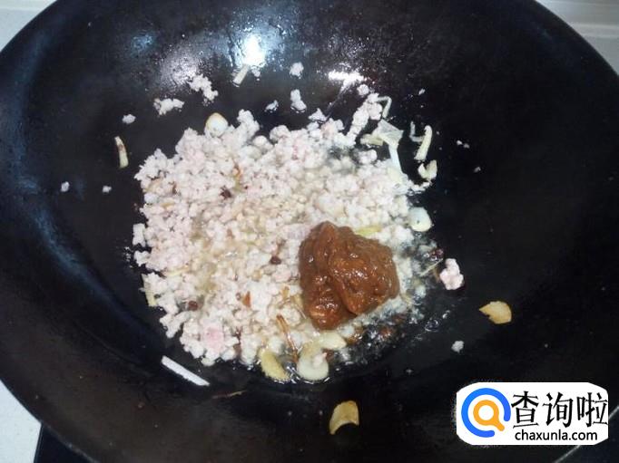 炒至肉末颜色微白,放入少许料酒,放入一匙儿豆酱稍翻炒一下。