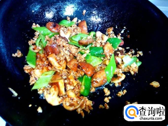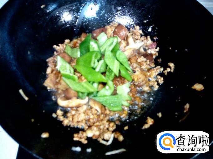 放入香菇转大火翻炒,香菇经水焯过,略翻炒即可,放入青尖椒翻炒(不要放盐)。