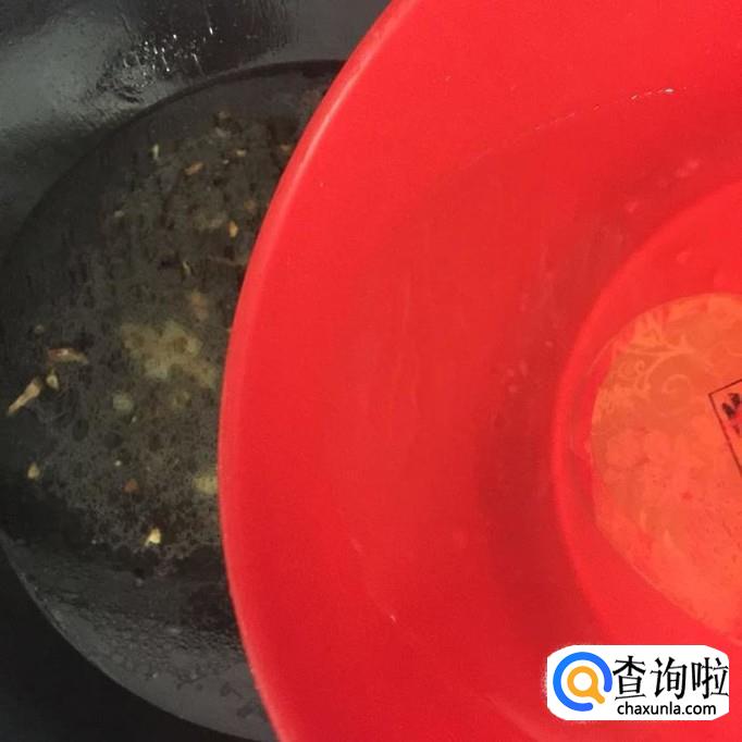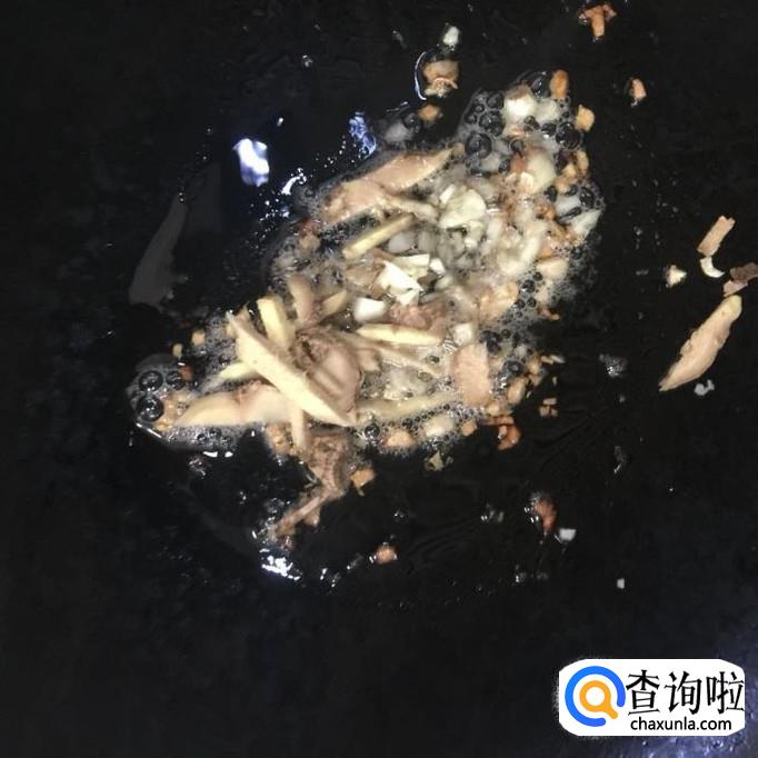 然后往锅中加入适量的猪油,倒入蒜蓉和生姜爆香,如下图所示。