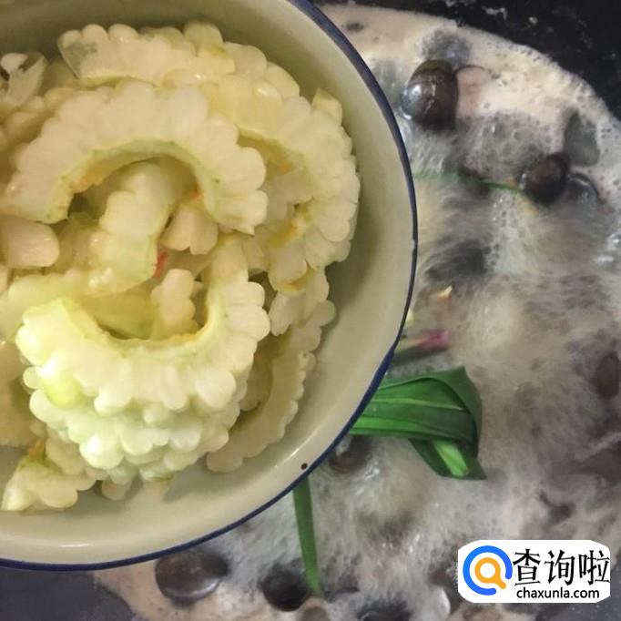 然后把苦瓜切成薄片,倒入锅中煮三分钟,如下图所示。