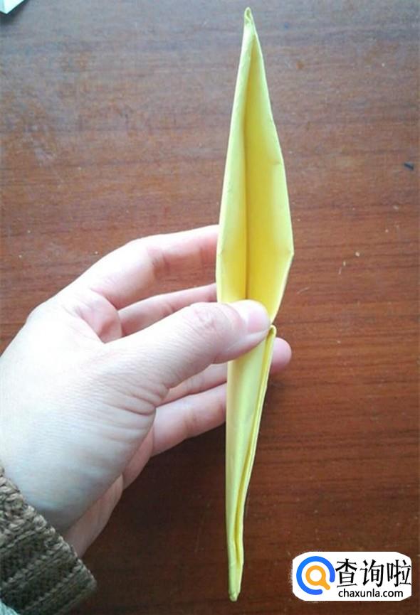 将彩纸沿着短边进行对折,这时彩纸变成了一个更加窄长的长方形,折后压平再打开,中间的中线印记下面会用到。