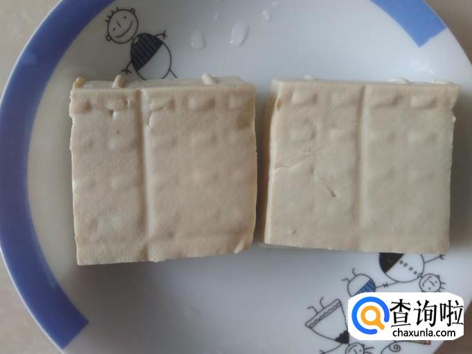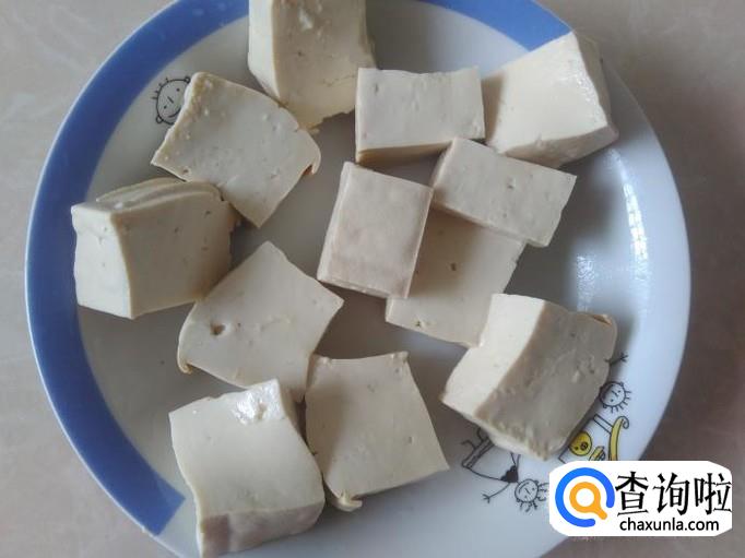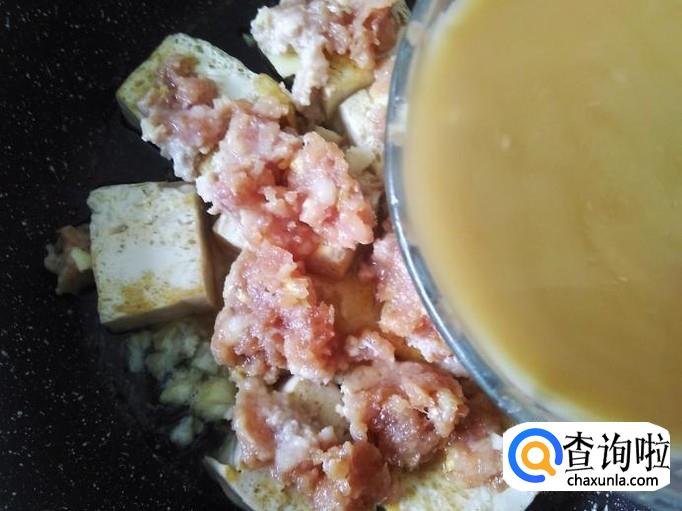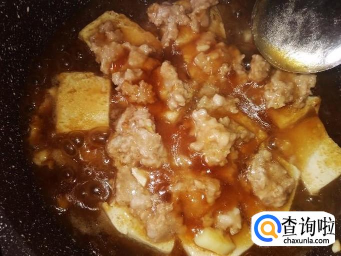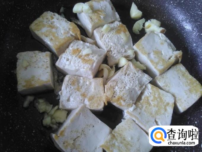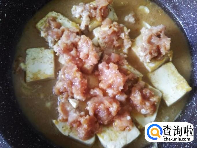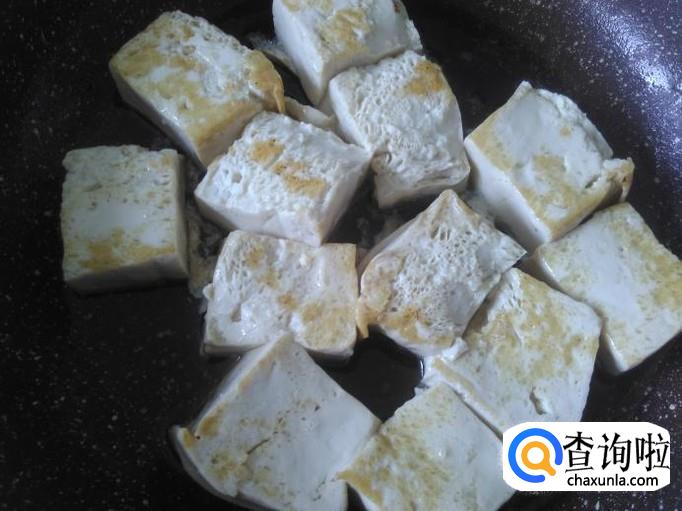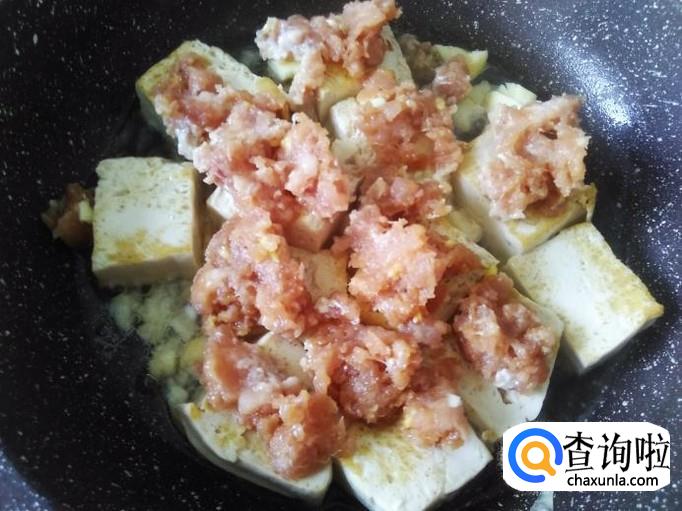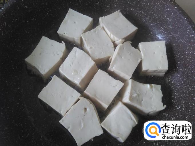把豆腐煎至四面微黄色,然后把肉末铺在豆腐上面。