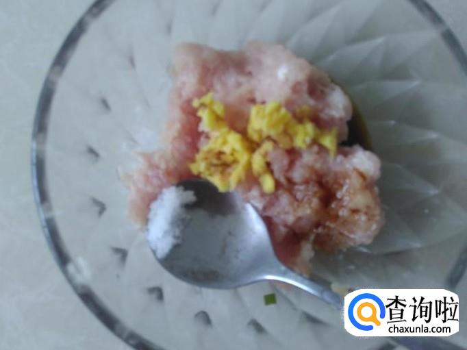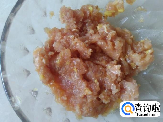 瘦肉剁成肉末,加适量的盐、姜蓉、生抽、料酒腌制几分钟。