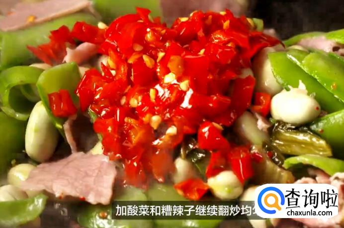 加一点白糖提鲜,炒匀后倒入少量热水,煮3~4分钟,等水差不多收干,加酸菜和糟辣子继续翻炒均匀,下小葱段,最后淋一点水淀粉勾芡,鲜香可口的酸菜炒蚕豆就做好了。