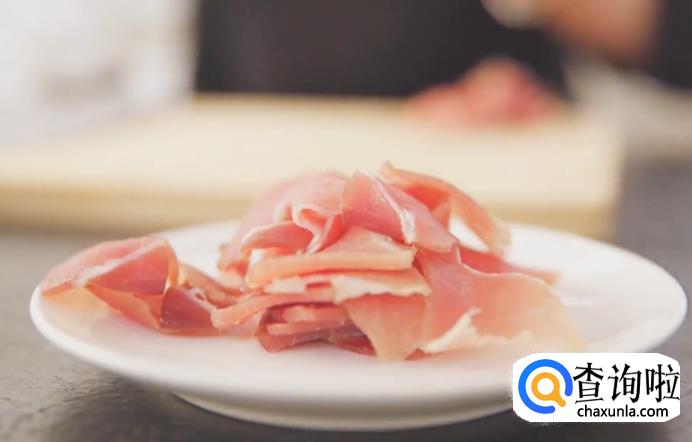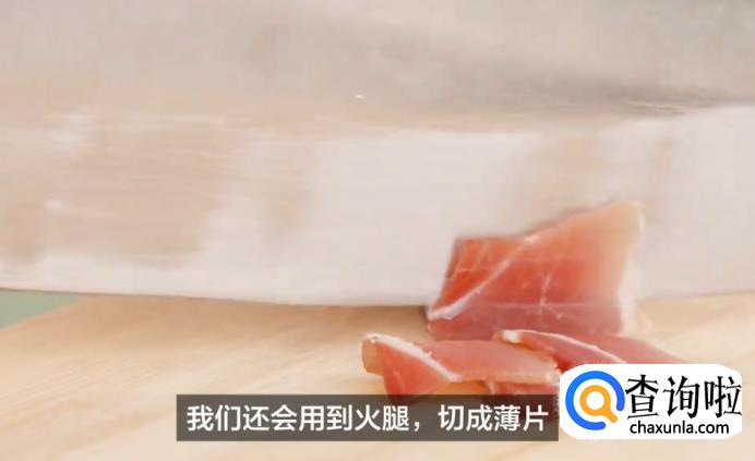 这道菜还会用到火腿,将火腿肉切成薄片备用。