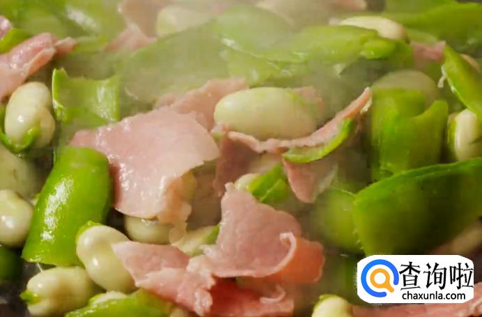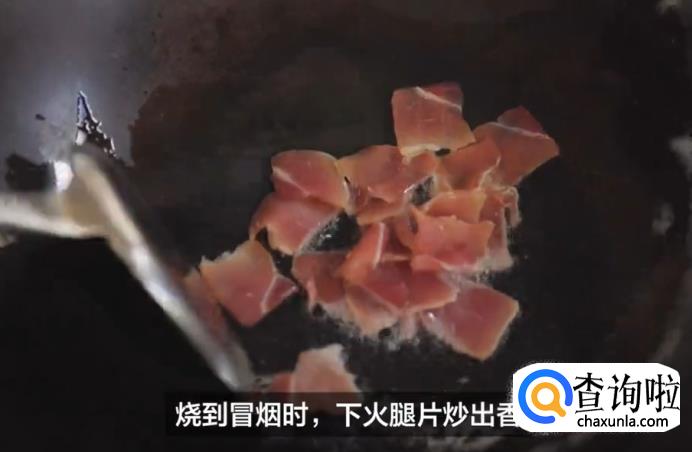 接下来起油锅,油烧到冒烟时,下火腿片炒出香,再依次下蚕豆皮和蚕豆瓣翻炒。