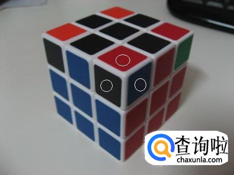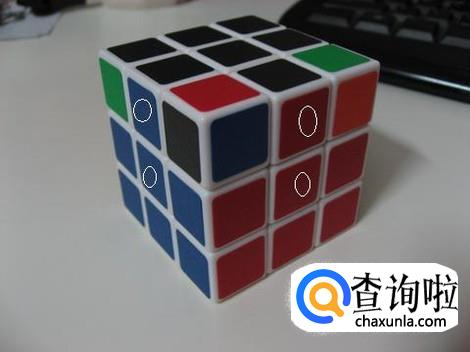 四侧面顶层中方块(十字归位)四侧面顶层中方块,也就是说四侧面最上面一层的中间的方块与中层的中心块相对应。如下图所示。口诀是:条件:找四侧面唯一面可以对上的,并以这面为“前”,其它面对不上。(如果有两面能对上,就用一次下面的口诀,就可以达到用口诀的条件了)右加,上加,右减,上加,右加,上加180度,右减。