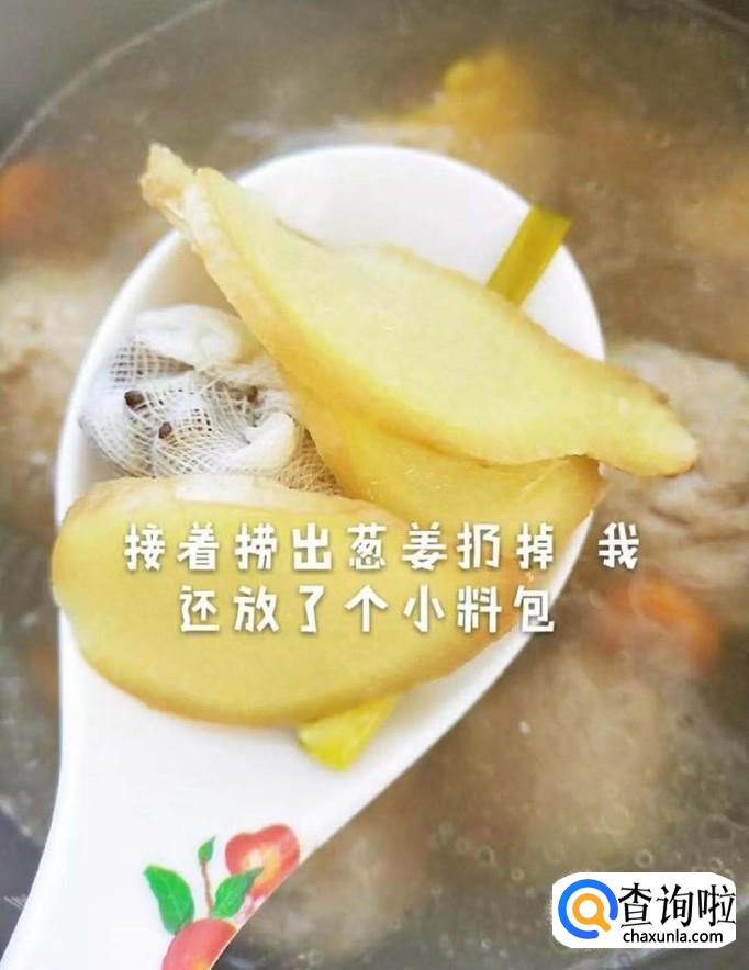 接着把葱姜捞出扔掉,如下图所示。小贴士:大家在煮汤的时候,也可以加入一些我们喜欢喝的小料包。