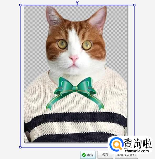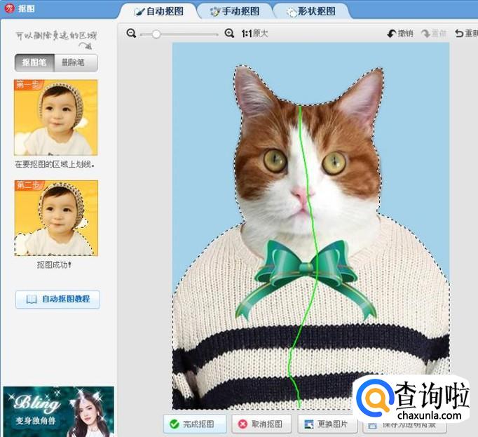 点击自动抠图后,把鼠标从猫的头顶到照片下方画一条线,这条线就变成绿色的,猫的头和身体就被虚线选定了,然后点击完成抠图。