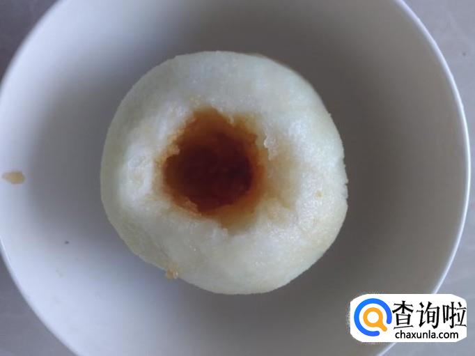 把雪梨皮去掉,用小刀把雪梨核口扣出来。