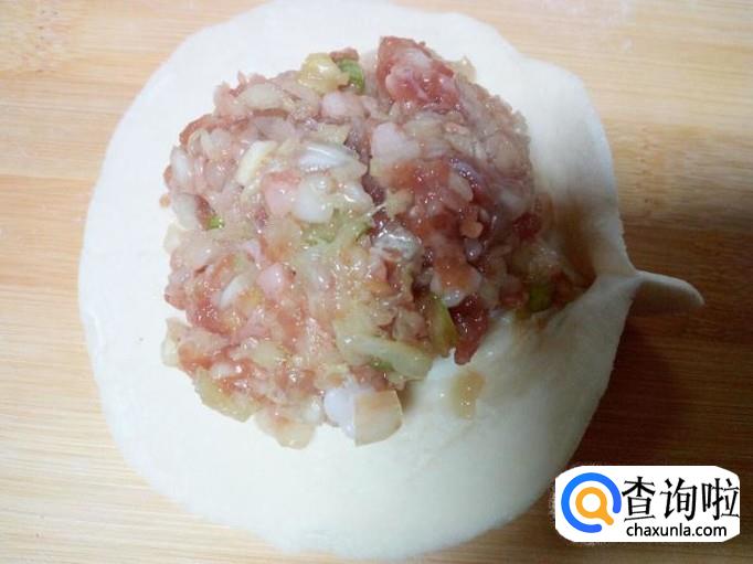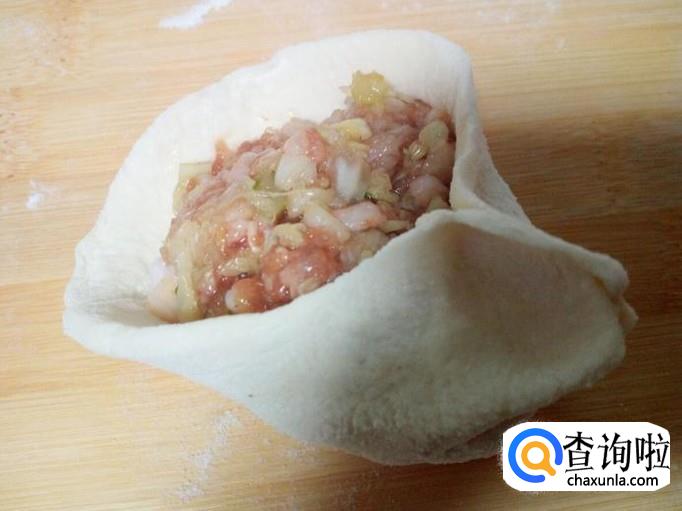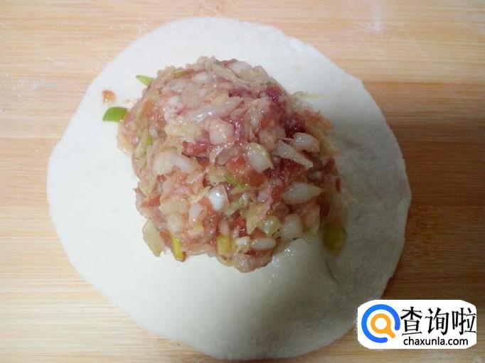 用匙儿把拌和好的包子馅,抟成团,放入面皮上,然后先用手捏住一个角,再按顺时针方向捏褶,捏成圆形后收口,形成包子形状。