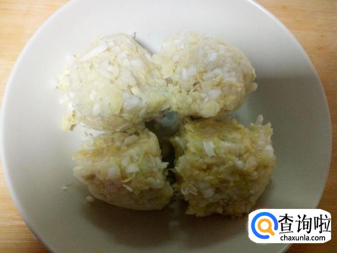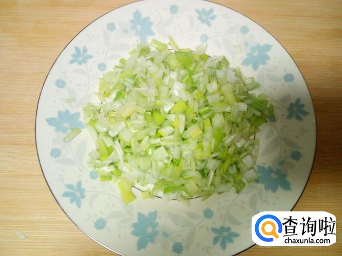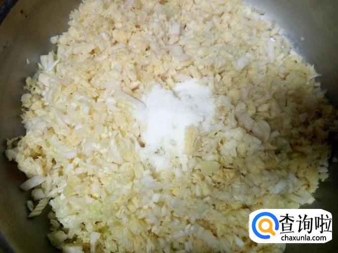 大白菜用水清洗干净,控干水分,切成碎末。放入一匙盐,再用手抓揉白菜,使白菜下水,然后用手攥干水分。