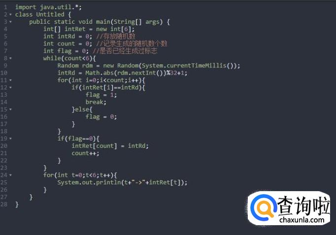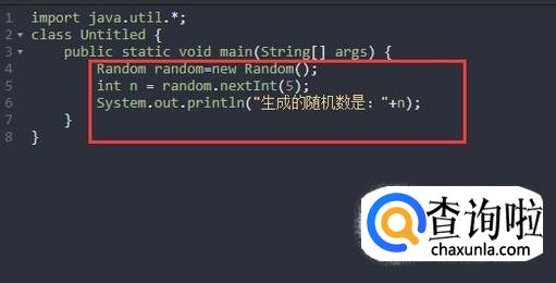 先在第一行引入util库,如下图所示,然后实例化Random,接着调用nextInt生成随机数,如下图所示
