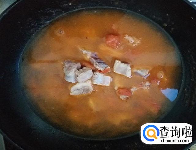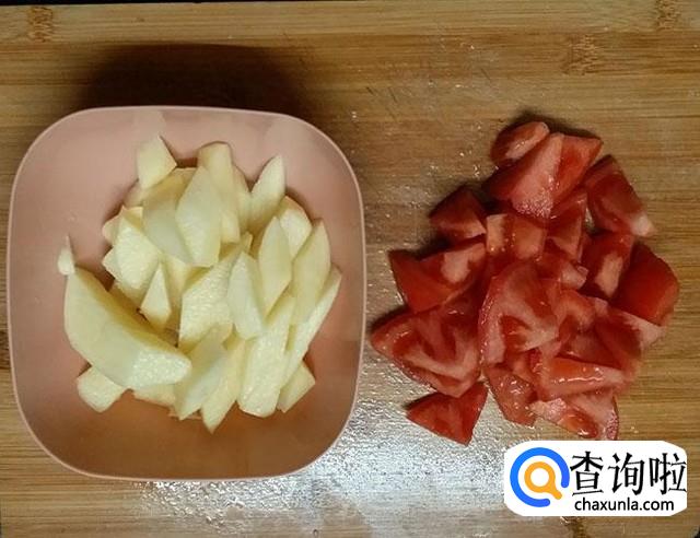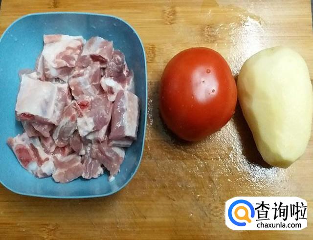 小排洗净切断,西红柿、土豆各一个洗净切块,备好姜片,蒜头,葱花