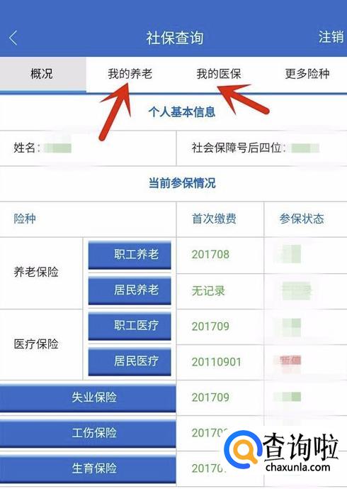 进入社保查询页面后,就可以查看到我们自己社保的情况了。这里还可以查看多种保险情况,比如养老保险和医疗保险等等,这些都能查询得到。