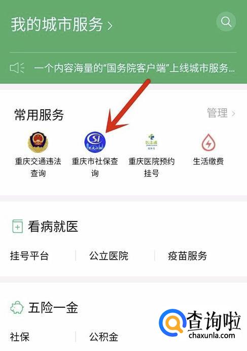 在进入城市服务功能之前,会先对自己所在的城市进行定位,当然也可以自己设置。比如是在重庆,只需要找到找到“重庆市社保查询”,并点击它即可。