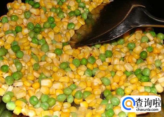 再烧油,将玉米粒,豌豆放入进行炒制,加少许盐,白砂糖炒均匀。