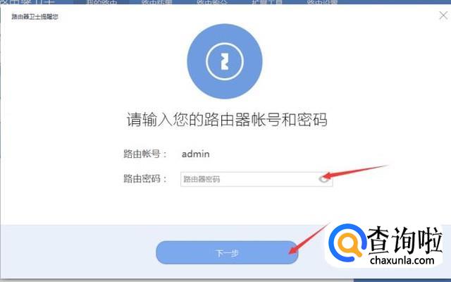 打开路由器卫士之后,在出现的界面输入自己路由器的账号和密码。点击下一步就可以登录上路由器安全卫士