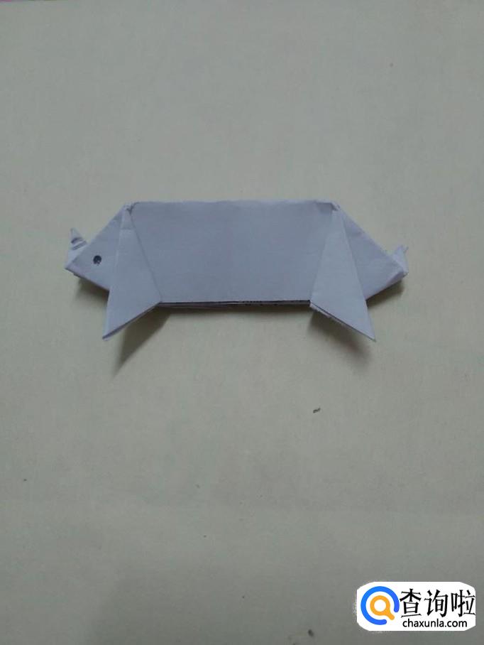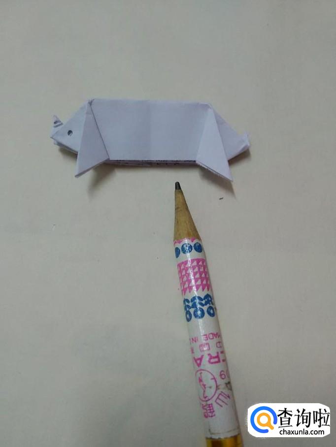 用铅笔在左侧猪头上画一个黑点,表示眼睛,在翻上去的小角上画两条横道,表示鼻子上的褶皱。小猪就折完了。
