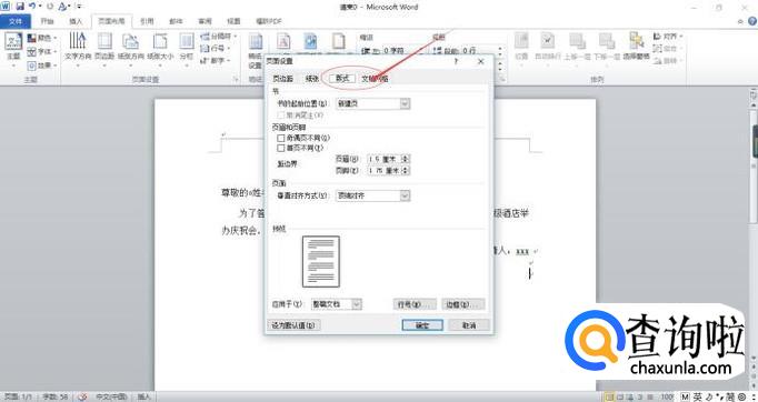 出现页面设置的对话框,点击“版式”。