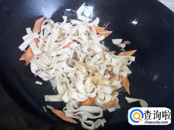 放入干豆腐翻炒,放入少许料酒,少许酱油,盐。放入一勺水,略烧一会。