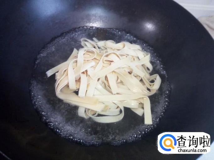 干豆腐用水冲洗一下,切成丝。放入水中浸泡一下,然后用水投几遍,控干水分。