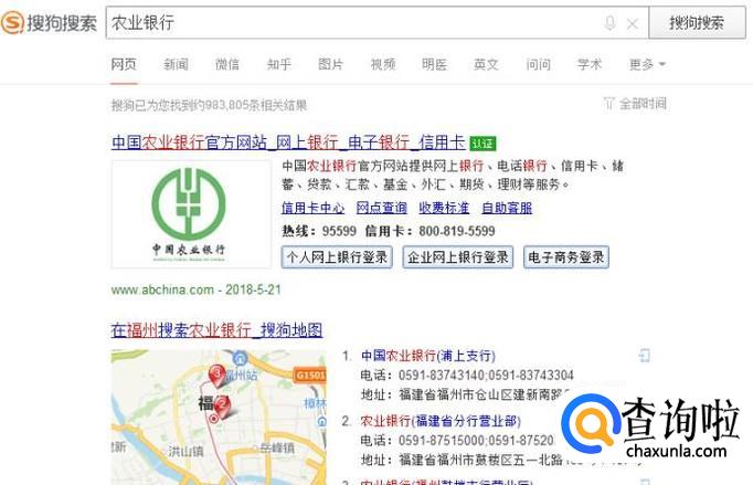 首先我们使用搜狗浏览器在浏览器的搜索栏输入农业银行,找到农业银行的官方网站。
