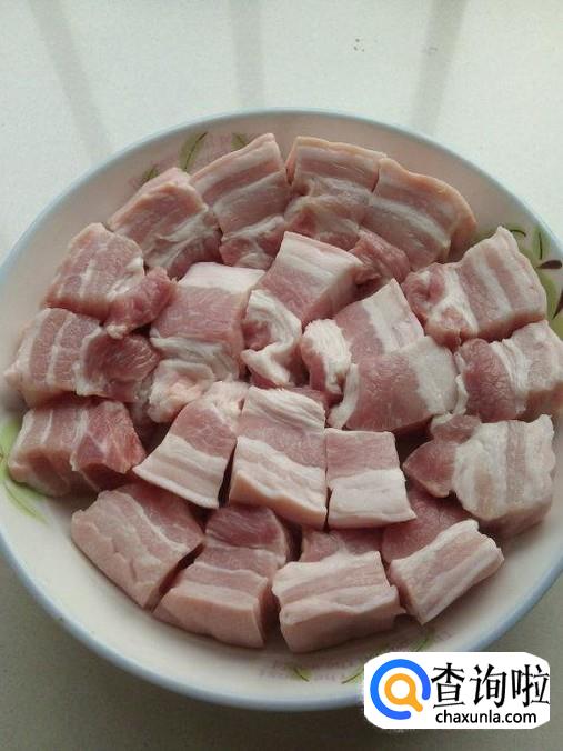 准备食材,五花肉备冷水下锅,煮开,捞出。将煮开的五花肉切成小方块。